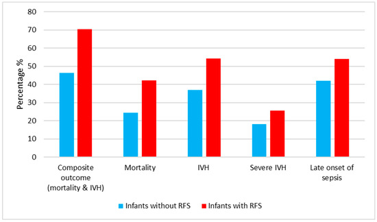 Percentage of neonatal morbidities and mortality stratified according to RFS.
