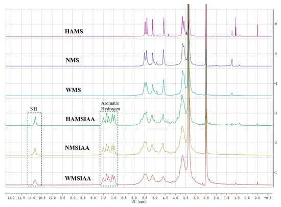 1H NMR spectra of starch. Note: HAMS: high-amylose maize starch; NMS: normal maize starch; WMS: waxy maize starch; HAMSIAA: indole acetylated high-amylose maize starch; NMSIAA: indole acetylated normal maize starch; WMSIAA: indole acetylated waxy maize starch.