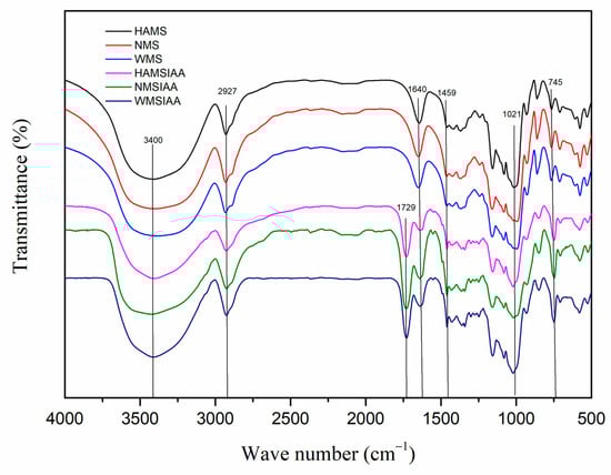 FTIR spectra of starch. Note: HAMS: high-amylose maize starch; NMS: normal maize starch; WMS: waxy maize starch; HAMSIAA: indole acetylated high-amylose maize starch; NMSIAA: indole acetylated normal maize starch; WMSIAA: indole acetylated waxy maize starch.