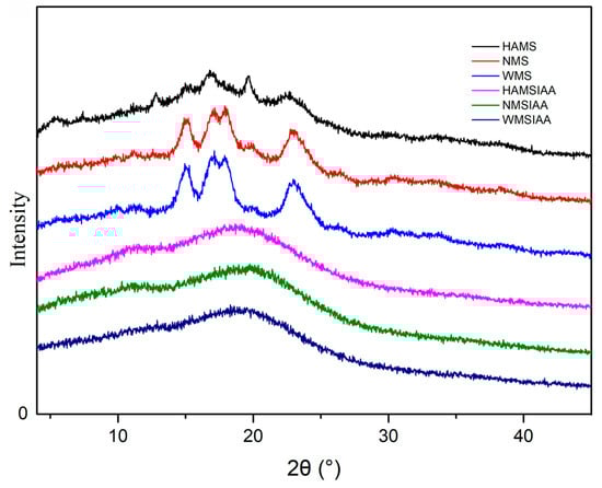 XRD patterns of starch. Note: HAMS: high-amylose maize starch; NMS: normal maize starch; WMS: waxy maize starch; HAMSIAA: indole acetylated high-amylose maize starch; NMSIAA: indole acetylated normal maize starch; WMSIAA: indole acetylated waxy maize starch.