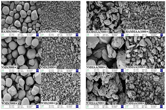 SEM of starch. Note: HAMS: high-amylose maize starch; NMS: normal maize starch; WMS: waxy maize starch; HAMSIAA: indole acetylated high-amylose maize starch; NMSIAA: indole acetylated normal maize starch; WMSIAA: indole acetylated waxy maize starch.