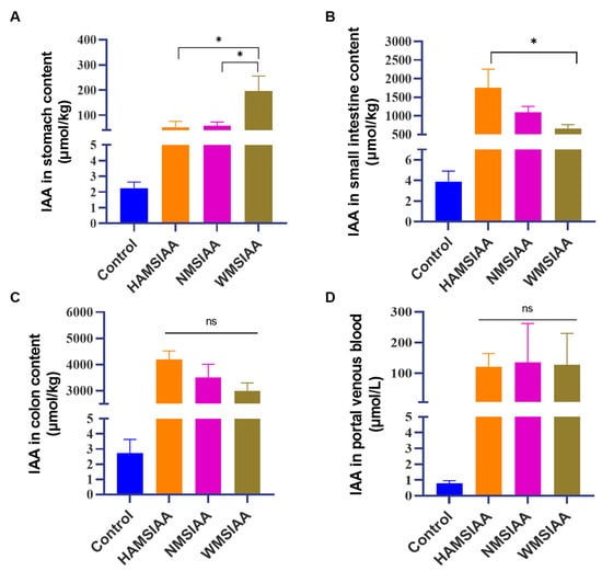 Colon-targeted IAA delivery in vivo. (A) IAA concentrations in stomach contents; (B) IAA concentrations in small intestine contents; (C) IAA concentrations in colon contents; (D) IAA concentrations in portal venous blood. Results are mean ± SEM (n = 6), * p < 0.05. Note: HAMSIAA: indole acetylated high-amylose maize starch; NMSIAA: indole acetylated normal maize starch; WMSIAA: indole acetylated waxy maize starch.