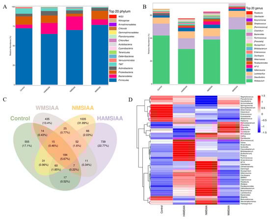Phylum (A), genus (B) changes, Venn diagram, (C) and heatmap (D) in mice fecal microbiota composition of control, HAMSIAA, NMSIAA and WMSIAA group. Note: HAMSIAA: indole acetylated high-amylose maize starch; NMSIAA: indole acetylated normal maize starch; WMSIAA: indole acetylated waxy maize starch.