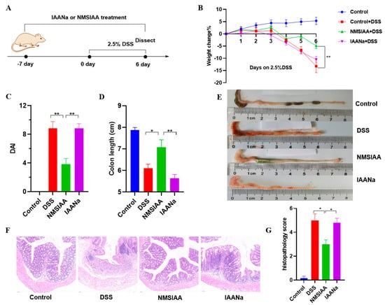 NMSIAA ameliorated DSS-induced murine colitis. The schematic diagram of animal study design (A). Weight change (B), DAI (C), colon length (D,E), histopathological changes in colonic tissues (F) and histopathology score (G). Results are mean ± SEM (n = 6), * p < 0.05, ** p < 0.01. Note: NMSIAA: indole acetylated normal maize starch.