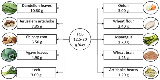 Fructooligosaccharides are a subclass of oligosaccharides known for their well-documented prebiotic effects [63]. These short-chain carbohydrates typically range from trisaccharides to decasaccharides and are characterized by a terminal sucrose unit [64]. Due to their prebiotic properties, fructooligosaccharides are widely used in the production of functional and low-calorie food products [65]. They serve as sweetening agents and biopreservatives, making them valuable components in food formulation [66]. The suggested daily intake of fructooligosaccharides is 12.5–20 g [11], and they naturally occur in various plant sources, including onions, chicory, garlic, bananas, and artichokes [14,67], as illustrated in Figure 3.