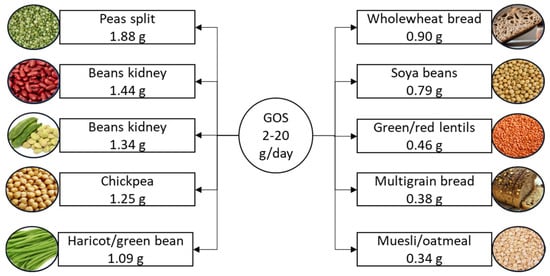 Suggested daily intake of galactooligosaccharides and the richest food sources. Galactooligosaccharide content is listed per 100 g of product. GOS, galactooligosaccharide.