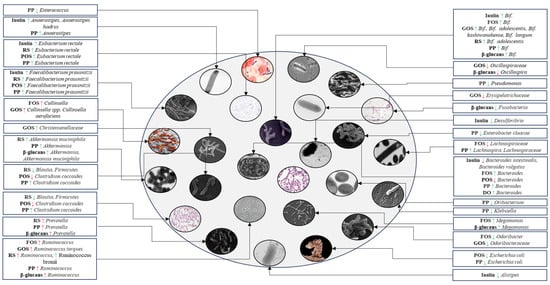 Certain Bifidobacterium species, including Bifidobacterium adolescentis, Bifidobacterium bifidum, Bifidobacterium pseudocatenulatum, Bifidobacterium longum, and Bifidobacterium dentium, show a negative association with T2DM, particularly in patients treated with metformin [184]. Butyrate-producing bacteria, such as Clostridium leptum, are negatively correlated with HgbA1c and fasting blood glucose levels [198]. Increased levels of Firmicutes are more prevalent in T2DM patients [199], while Lachnospira shows a negative association with fasting blood glucose in diabetic models [200]. Alistipes is linked to obesity and metabolic syndrome [201], and increased levels of Desulfovibrio and Odoribacter have been observed in T2DM [184,202]. Higher abundances of Erysipelotrichaceae are noted in cases of obesity and T2DM [203], and Enterobacter cloacae is associated with impaired glucose tolerance [204]. Furthermore, impaired immune responses in diabetes heighten the risk of infections by Klebsiella pneumoniae [205]. In metabolic syndrome, increased levels of Odoribacter have been observed [206], and a case study highlighted Clostridium perfringens causing a liver abscess in a diabetic patient, underscoring its opportunistic nature in immunocompromised individuals [207]. High-fat diets have also been linked to increased abundances of Pseudomonas in obese mice [208]. Changes in gut microbiota composition in response to prebiotics in T2DM are illustrated in Figure 5.