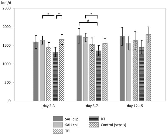 Mean energy expenditure. SAH: subarachnoid hemorrhage; clip: refers to microsurgical aneurysmal securing; coil: refers to aneurysm coil embolization; ICH: intracerebral hemorrhage; TBI: traumatic brain injury. Error bars indicate 95% confidence intervals. * p < 0.01; # p < 0.05.