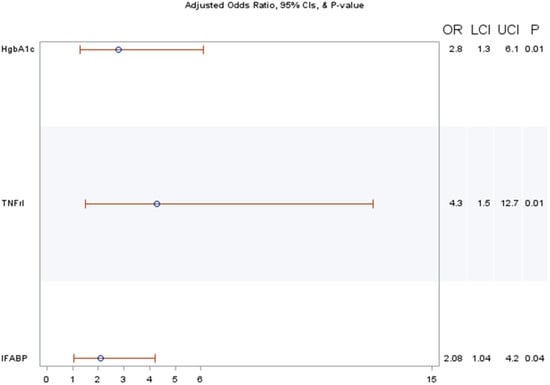Among PWH (Figure 1), every unit increase in HgbA1c (p = 0.003), TNFrI (p = 0.002), and IFAB-P (p = 0.004) was associated with having the highest (≥3.6 μM) plasma erythritol.