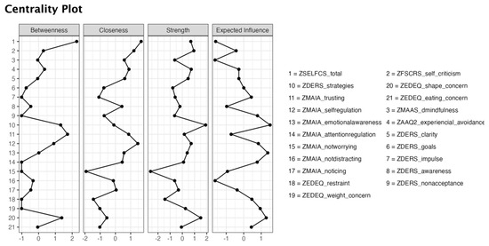 The estimation of the centrality indices allowed the identification of the most central variables in the network [58]. In this study’s network model, the nodes with the highest betweenness centrality were self-compassion (SELFCS), trusting (MAIA), shape concerns (EDE-Q), and strategies (DERS). Higher betweenness values indicate that a node behaves as a bridge between several nodes in a network, i.e., it is located in a proximal crossing path between other pairs of nodes [59]. The nodes with the highest closeness centrality were self-compassion (SELFCS), self-regulation (MAIA), and self-criticism (FSCRS), and the nodes with the highest strength centrality were strategies (DERS) and shape concerns (DERS). Finally, the nodes with higher values of expected influence were strategies (DERS), shape concerns (DERS), and emotional awareness (MAIA). Higher values generally indicate that a node is more likely to affect other nodes/symptoms in the network [59].