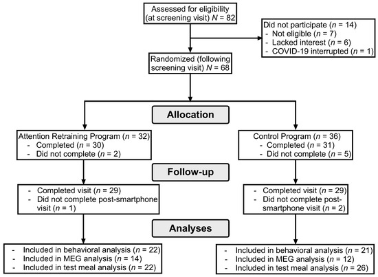 Sample size estimation was based on the power analysis for the first hypothesis (changes in AB scores following completion of the smartphone program). Meta-analytic studies of AR programs in adults found that AR programs produce large effects (d = 0.80–1.41) on reduction in AB and medium effects (d = 0.51–0.61) on target behaviors, such as smoking and eating [41,42]. Based on recommended equations for estimating sample size [60] when using general linear models, and assuming 35% attrition due to incomplete visual probe or MEG data [53,61,62], 80 girls, with a planned recruitment of 40 with LOC-eating and 40 without LOC-eating, were estimated to provide >80% power to detect medium to large effects.