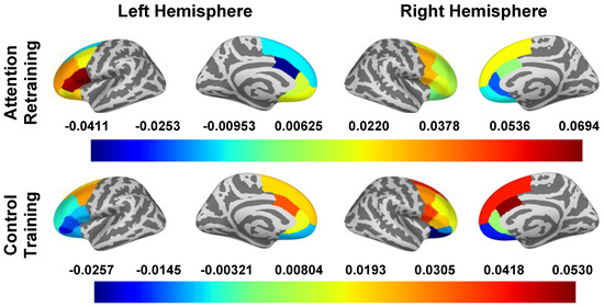 The main effects of the smartphone program on the change in oscillatory power during attention deployment are reported in Table 5 and Figure 4. In “top-down” regions, there were small to large effects of condition on the caudal ACC (d left hemisphere = −0.817, d right hemisphere = −0.594), left dlPFC (d caudal = −0.228, d rostral = −0.472, d superior = −0.286), and left vlPFC (d pars opercularis = −0.802, d pars orbitalis = −0.545, d pars triangularis = −0.805). The AR group had a decrease in oscillatory power among these regions, except for the right pars orbitalis, where increased oscillatory power was observed. The control group had an increase in oscillatory power in these regions, except for in the left pallidum and right pars orbitalis, where decreased oscillatory power was observed.