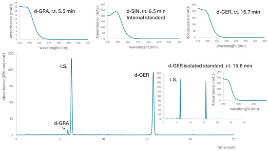 Typical chromatogram of desulfated glucosinolates in the E. sativa extract. Above UV spectra of internal standard (I.S.) desulfo sinigrin (SIN) and identified desulfoglucosinolates, glucoraphanin (GRA) and glucoerucin (GER) are reported with their retention times (r.t.). The insert on the right shows a chromatogram of purified GER and I.S. for the determination of purity on a weight basis.