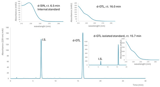 Typical chromatogram of desulfated glucosinolates in the L. sativum extract. Above UV spectra of internal standard (I.S.) desulfo sinigrin (SIN) and glucotropeaolin (GTL) are reported with their retention times (r.t.). The insert on the right shows a chromatogram of isolated GTL and I.S. for the determination of purity on a weight basis.
