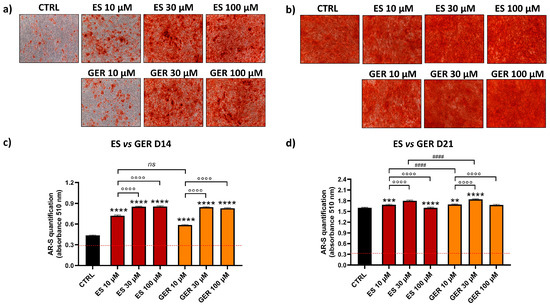 AR-S on ES- and GER-treated cells vs. CTRL cells during osteogenic stimulation. Panels (a,b) show representative images at D14 ARS (a) and D21 (b). Panels c and d show histograms (mean ± SEM) of AR-S quantification obtained by 177 measurements in duplicate for each of the N = 8 donors comparing ES (red), GER (orange), CTRL (black) at D14 (c) and D21 (d). Friedman–Dunn’s multiple-comparisons test: *: Comparisons between CTRL and treatments (at each concentration); °: Comparisons between different concentrations of each treatment (10 μM vs. 30 μM; 10 μM vs. 100 μM); #: Comparisons between different treatments at the same concentration (es 10 μM ES vs. 10 μM GER). ** p < 0.01; *** p < 0.001; ****, °°°°, #### p < 0.0001, ns = non significant. ES extract concentration is expressed as GER content (μM).