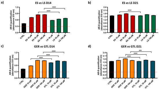 AR-S on ES-, GER-, LS-, and GTL-treated cells vs. CTRL cells during osteogenic stimulation. Panels (a–d) show histograms (mean ± SEM) of AR-S quantification obtained by 177 measurements in duplicate for each of the N = 8 donors comparing (a) ES (red) vs. LS (green) D14; (b) ES vs. LS D21; (c) GER (orange) vs. GTL (blue) (D14); (d) GER vs. GTL (D21). Friedman–Dunn’s multiple-comparisons test: #: Comparisons between different treatments at the same concentration (es 10 μM ES vs. 10 μM GER). #### p < 0.0001. ES and LS extract concentrations are expressed as GER and GTL content (μM), respectively.