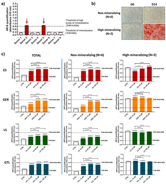 Figure 6c shows a comparison among (1) the entire population (TOTAL), (2) the group of cells not producing mineral matrix at D14 (non-mineralizing; N = 6), and (3) the group of donors producing early high levels of mineral matrix at D14 (high-mineralizing; N = 2). When we analyzed AR-S quantification, in the non-mineralizing donors (N = 6) we found the highest ability of stimulation for all compounds tested compared to CTRL cells. ES increased the amount of mineral deposition by 2.9-fold (10 μM ES), 3.2-fold (30 μM ES), and 3.2-fold (100 μM ES); GER increased the amount of mineral deposition by 1.7-fold (10 μM GER), 3.0-fold (30 μM GER), and 3.0-fold (100 μM GER). LS increased the amount of mineral deposition by 1.9-fold (10 μM LS), 2.3-fold (30 μM LS), and 2.4-fold (100 μM LS); GTL increased the amount of mineral deposition by 2.5-fold (10 μM GTL), 3.1-fold (30 μM GTL), and 2.9-fold (100 μM GTL) D14. GER. When we analyzed AR-S quantification, in the group producing early high levels of mineral matrix (high-mineralizing) (N = 2), we found only negligible differences for all compounds tested compared to CTRL cells, thus evidencing that the stimulus of Brassica seed extracts and both isolated GLSs is ineffective when the mineralization is highly advanced.