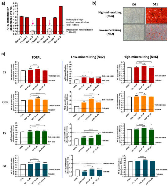 Confirming this interpretation, there were only negligible differences in the entire population and in the high-mineralizing subgroup at D21 (Figure 7c). On the other hand, when we analyzed AR-S quantification, selecting the two cases that displayed low levels of mineralization at D21, we still found an ability to stimulate the osteogenesis for most compounds tested. In particular, ES increased the amount of mineral deposition by 1.6-fold (10 μM ES), 1.4-fold (30 μM ES), and 1.3-fold (100 μM ES); GER increased the amount of mineral deposition by 1.6-fold (10 μM GER), 2.2-fold (30 μM GER), and 1.6-fold (100 μM GER). Similarly, LS increased the amount of mineral deposition by 1.2-fold (10 μM LS), 1.1-fold (30 μM LS), and 1.6-fold (100 μM LS), while unlike ES, LS, and GER, no stimulatory effect was found for GTL.