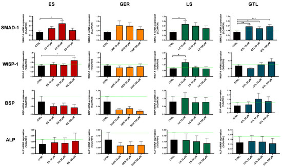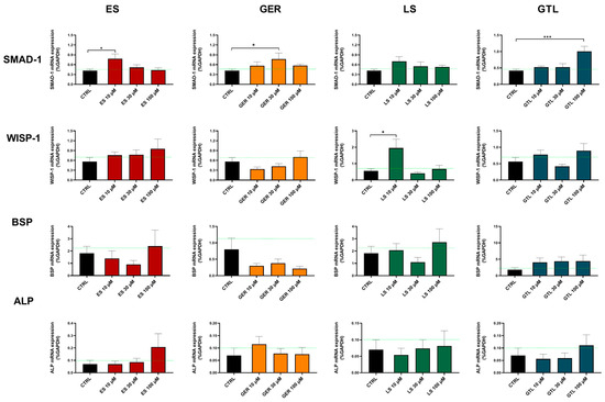 Among the markers tested here, SMAD-1 was the one most regulated at both D14 and D21 (Figure 8 and Figure 9). At D14, GTL activated SMAD-1 expression at each concentration tested: 10 μM (p < 0.01), 30 μM (p < 0.05), and 100 μM (p < 0.001), while ES at 30 μM (p < 0.05), LS at 10 μM (p < 0.05), and GER displayed a non-significant increasing trend (Figure 8). At D21, only GTL at 100 μM (p < 0.001), ES at 10 μM (p < 0.05), and GER at 30 μM (p < 0.05) showed significant stimulation of expression (Figure 9). WISP-1 was significantly up-regulated by ES at 100 μM (p < 0.05) at D14 (Figure 8) and LS at 10 μM (p < 0.05) at D14 and D21 (Figure 8 and Figure 9). Only GER at 100 μM (p < 0.05) significantly up-regulated BSP expression at D21 (Figure 9). Neither extracts nor GLSs further increased ALP expression with respect to CTRL cells (Figure 8 and Figure 9).
