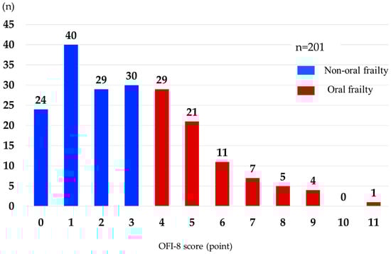 An overview of the process used to select the study participants is shown in Figure 1. In total, 225 eligible patients were enrolled. Eight patients were excluded because of their transfer to another hospital (n = 4), the cessation of HD owing to kidney transplantation (n = 2), hospitalization for cerebral infarction (n = 1), or cardiac pacemaker implantation (n = 1). Sixteen (7.4%) of the remaining 217 patients died during the one-year follow-up period, leaving the data for 201 patients for analysis. Baseline OFI-8 and changes in each index were evaluated in these 201 patients (139 men, 62 women; mean age, 69.8 ± 13.2 years). The distribution of the OFI-8 scores is shown in Figure 2. Oral frailty was identified in 78 patients, giving a prevalence rate of 38.8%.