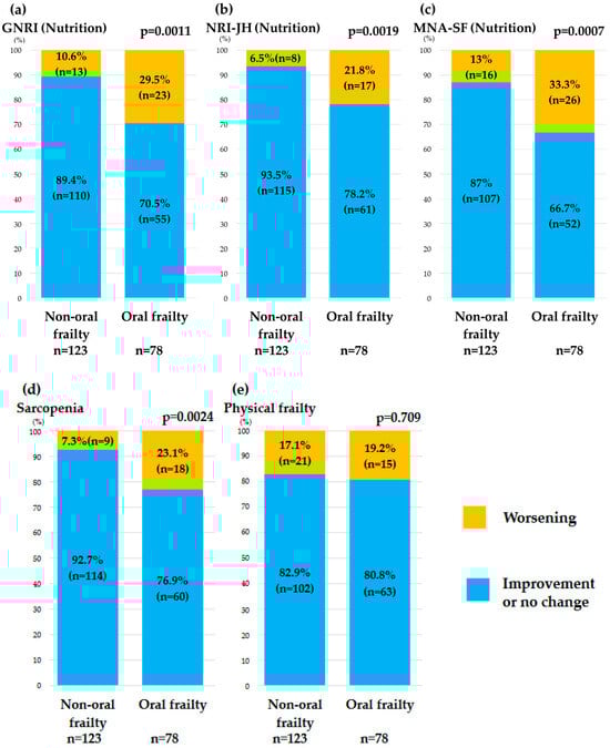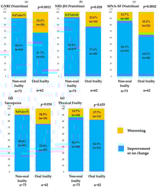 Worsening in the GNRI, NRI-JH, and MNA-SF categories over 1 year was significantly greater in the oral frailty group than in the non-oral frailty group. After 1 year, worsening of the sarcopenia category was significantly greater in the oral frailty group. However, there was no between-group difference in the deterioration of physical frailty (Figure 3).