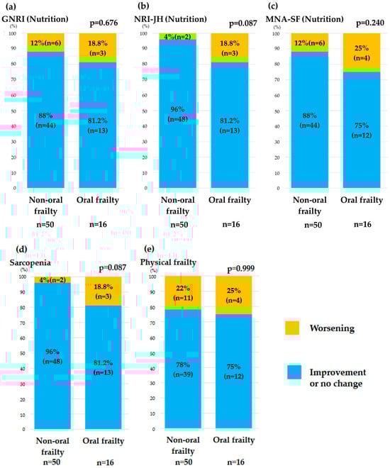 In elderly patients, there was no significant between-group difference in baseline characteristics except for the proportion with physical frailty (Table 3 and Table 4). Worsening in the GNRI, NRI-JH, and MNA-SF categories over 1 year was significantly greater in the oral frailty group than in the non-oral frailty group. After 1 year, worsening of the sarcopenia category was significantly greater in the oral frailty group. However, there was no between-group difference in the deterioration of physical frailty (Figure 4).