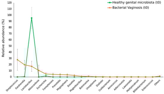 As for the bacterial composition at t0, shown in Table 2 and Figure 1, women with BV showed increased relative abundance, as compared to women with a healthy vaginal microbiota, for the bacterial genera Streptococcus spp. (27.9% vs. 0.1%, p < 0.01), Gardnerella spp. (19.8% vs. 0.5%, p < 0.0001), Alloscardovia spp. (10.6% vs. 0.003%, p < 0.01), Fannyhessea spp. (4.2% vs. 0.01%, p < 0.000001), Prevotella spp. (3.9% vs. 0.1%, p < 0.001), Megasphaera spp. (3.6% vs. 0.002%, p < 0.00001), Sneathia spp. (2.5% vs. 0.004%, p < 0.001), and Aerococcus spp. (0.3% vs. 0.001%, p < 0.00001). By contrast, women with a healthy vaginal microbiota had a significantly higher prevalence of Lactobacillus spp. (95.4%) than did women with BV (17.2%, p < 0.0000001) (Table 2).