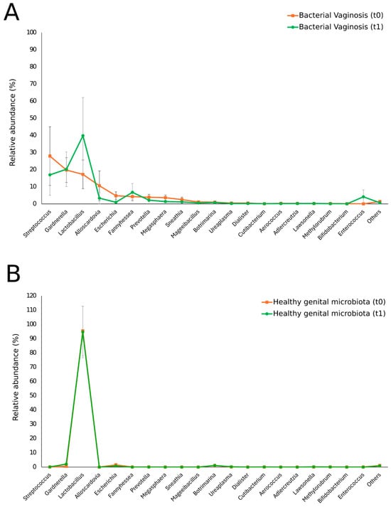 Vaginal microbiota composition in the study population before and after 2 months of probiotic supplementation. Women with asymptomatic BV (A) and women with a healthy vaginal microbiota (B), at t0 and t1. Only taxa with abundances greater than 0.01% in any sample were included in the graphs. All values are expressed as mean ± relative standard error.