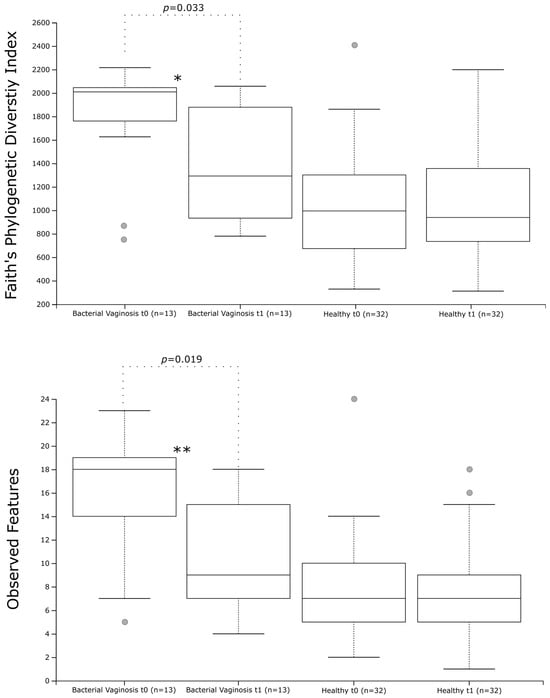 Comparison of the alpha-diversity of the vaginal microbiota in women with BV and women with a healthy vaginal microbiota, at baseline (t0) and after (t1) 2 months of probiotic supplementation. Faith’s phylogenetic diversity and observed features were used as measures of alpha-diversity within groups. The circles out of range represent the outliers. * p < 0.001 and ** p < 0.0001 vs. women with a healthy vaginal microbiota.