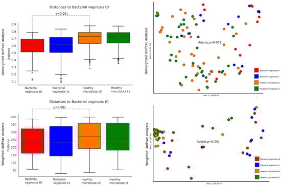 Comparison of the beta-diversity of the vaginal microbiota in women with BV and women with a healthy vaginal microbiota, at baseline (t0) and after (t1) 2 months of probiotic supplementation. On the left, the boxplot representations of within-group distances, and on the right the principal coordinate analysis (PCoA) plots, of unweighted and weighted UniFrac distance matrices, are illustrated. Each dot represents the vaginal bacterial community composition of one individual, and the groups were compared using Adonis for beta-diversity measures.