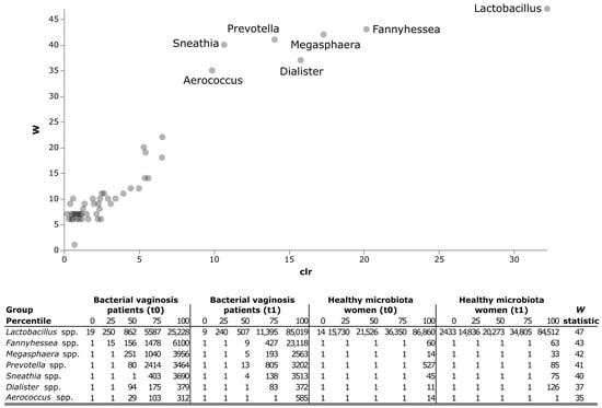 ANCOM test of the vaginal microbiota between women with BV and women with a healthy genital microenvironment, either at baseline or after 2 months of probiotic supplementation. ANCOM employs a heuristic strategy to declare taxa that are significantly differentially abundant, and, for any given taxon, the output W statistic represents the number of additive log ratio (ALR) transformed models, where the taxon is differentially abundant; hence, the larger the value of W, the more likely the taxon is differentially abundant.