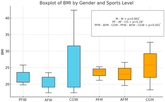 Distribution of BMI values by sex and sports level (n = 170). M—male; W—female; PF—professional football level; AF—amateur football level; CG—control group; PFM—male professional football player; PFW—female professional football player; AFM—male amateur football player; AFW—female amateur football player; CGM—male control group; CGW—female control group; * = p < 0.05.