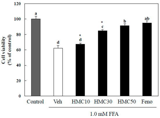 Cell Viability with HMC. Cell viability was stimulatied with 1.0 mM FFA stock solution (oleate/palmitate = 2:1) and then treatment with HMC (10, 30, and 50 μM) for 24 h. Each value is expressed as the mean ± standard deviation (n = 3), and values with different superscript letters were markedly different with p < 0.05 as analyzed using ANOVA, followed by Tukey’s HSD test. *: Statistically significant differences.