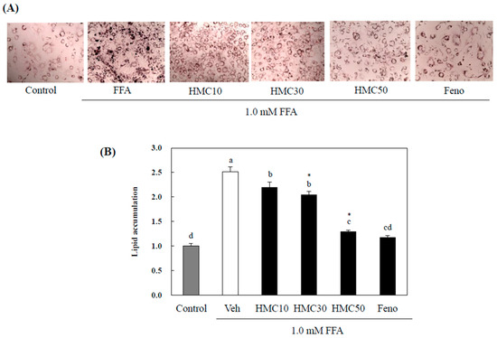 HMC inhibits lipid accumulation in FFA-induced hepatic steatosis. (A) Cells were fixed and stained with Oil Red O staining to visualize the lipid droplets by microscopy (magnification = 100X). Scale bar = 100 μM. (B) The effects of HMC on the inhibition of lipid accumulation. Each value is expressed as the mean ± standard deviation (n = 3), and values with different letters were markedly different with p < 0.05 as analyzed using ANOVA, followed by Tukey’s HSD test. *: Statistically significant differences.