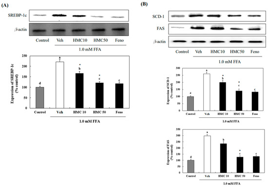 In FFA-exposed HepG2 cells, treatment with 10 and 50 μM HMC markedly reduced SREBP-1c expression by 166.43% and 121.11%, respectively, which was increased to 221.10% by FFAs (Figure 4). The 10 μM fenofibrate reduced SREBP-1c expression to 117.84%, which was not markedly different from the result of 50 μM HMC treatment. SCD-1 and FAS were also markedly increased to 259.98% and 297.45%, respectively, in HepG2 cells exposed to FFAs compared to that in the normal control cells. However, treatment with 10 and 50 μM HMC markedly decreased SCD-1 to 200.31% and 139.52% and FAS to 234.61% and 127.88%, respectively, compared to that in FFA-exposed HepG2 cells.