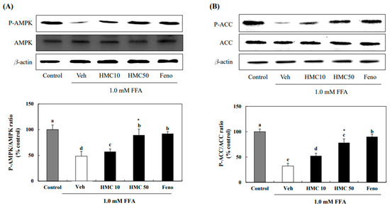 HMC promotes AMPK and ACC in FFA-induced hepatic steatosis. (A) The protein expression of AMPK. (B) The protein expression of ACC. Each value is expressed as the mean ± standard deviation (n = 3), and values with different superscript letters were markedly different with p < 0.05 as analyzed using one-way analysis of variance (ANOVA), followed by Tukey’s HSD test. *: Statistically significant differences.