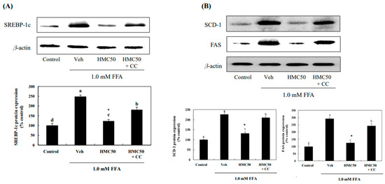 HMC inhibits the phosphorylation of SREBP-1c, SCD-1, and FAS in FFA-induced hepatic steatosis. (A) The protein expression of SREBP-1c. (B) The protein expression of SCD-1 and FAS. Each value is expressed as the mean ± standard deviation (n = 3), and values with different superscript letters were markedly different with p < 0.05 as analyzed using ANOVA, followed by Tukey’s HSD test. *: Statistically significant differences.