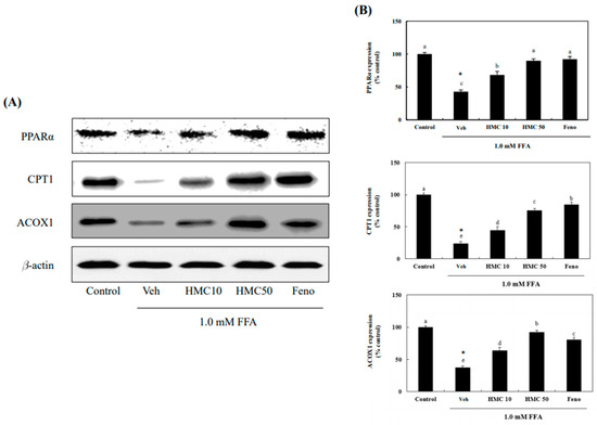 HMC increases the protein expression of PPARα, CPT1, and ACOX1. (A) The protein expression of PPARα, CPT1, and ACOX1. (B) Expression of PPARα, CPT1, and ACOX1. Each value is expressed as the mean ± standard deviation (n = 3), and values with different superscript letters were markedly different with p < 0.05 as analyzed using one-way analysis of variance (ANOVA), followed by Tukey’s HSD test. *: Statistically significant differences.