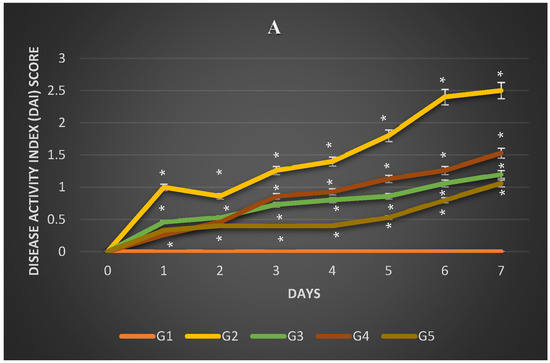 The colitis was chemically induced by administering dextran sulfate sodium (DSS—MP Biomedicals, USA). The DSS (4%) was dissolved in the water provided daily to the rats for 7 days (W2). The disease activity index (DAI) was scored including body weight loss, stool consistency, and rectal bleeding as described by Toumi et al. [40]. In brief, each score was determined as the extent of body weight loss (0: <1%; 1: 1–5%; 2: 5–10%; 3: 10–20%; and 4: >20%), stool consistency (0 = normal; 2 = loose; and 4 = diarrhea), and gross bleeding (0 = normal color; 2 = reddish color; and 4 = bloody stool), and combined and divided by 3 for each rat.