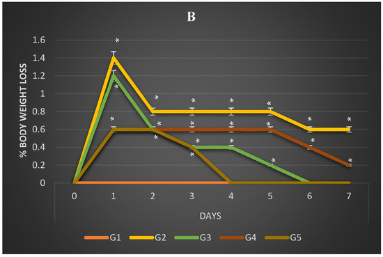 Evaluation of colitis. (A) Disease activity index (DAI); and (B) body weight change (%) during the induction period in week 2. G1: normal group; G2: DSS group; G3: test groups treated with sulfasalazine; G4: test groups treated with soymilk; and G5: test groups treated with fermented soymilk. Data are presented as mean ± SEM. * The level of significance was present at p < 0.05 compared to the control at the same period (5 rats/group; n = 25).