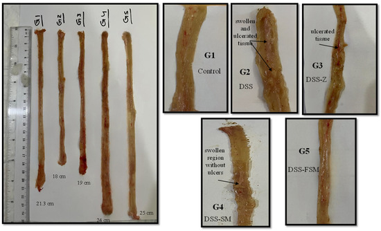 Rats were acclimated for 10 days before the experiment [39]. Dosing of SM and FSM was administered daily by gavage in the morning. The procedure was as follows: from 0–7 days, G4 and G5 were supplemented with an equal volume (2 mL per kg/BW/Day) of SM and FSM, respectively, once a day for one week (Table 1). From the 8th day, UC was induced by administering 4% DSS in drinking water for 7 days of the testing period of all groups except for the G1, which received distilled water (Table 1). DSS solution was freshly prepared and replaced every 2 days. From day 15 to day 30, G3 was treated daily by gavage with 100 mg/kg sulfasalazine for 14 days, while G4 and G5 were treated with 2 mL of SM and FSM, respectively, for 16 days.