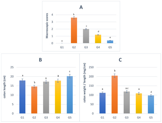 Macroscopic analysis of damage along the colon, which includes macroscopic score (A), colon length (B), and colon weight/length (C). G1: normal group; G2: DSS group; G3: test groups treated with sulfasalazine; G4: test groups treated with soymilk; and G5: test groups treated with fermented soymilk. Data are presented as mean ± SEM. The significance level was present at p < 0.05 compared to the control at the same period (5 rats/group; n = 25). abcde means with different superscript letters indicate the significance level at p < 0.05 compared to control.