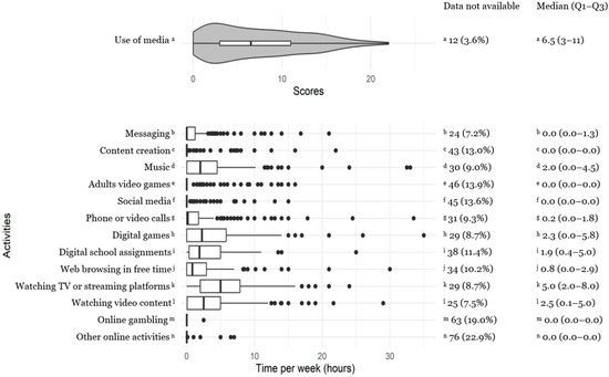 Figure 1 reports the sample’s distributions relative to media usage score and time spent on online and digital activities. Children’s main digital activities involved watching TV or streaming platforms (average 5.0 h per week, IQR 2.0–8.0) and watching video content (average 2.5 h, IQR 0.1–5.0), followed by digital games (average 2.3 h, IQR 0.0–5.8).