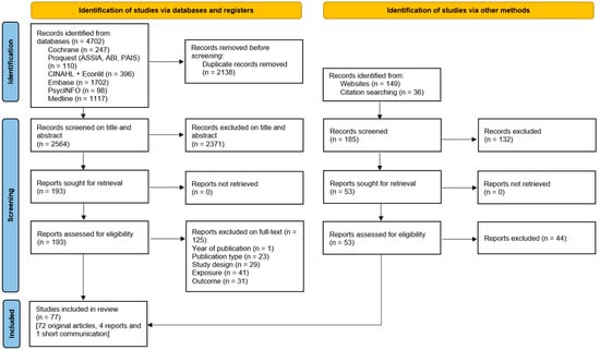 From database searching, 4702 articles were identified, with 2564 remaining after duplicate removal, see Figure 1 for the flowchart. Following title and abstract screening, 2371 were excluded and 193 articles were screened on full-text, with an additional 53 from grey literature searches and citation searching, of which 77 articles were final includes (72 original articles, four grey literature articles, one short communication).