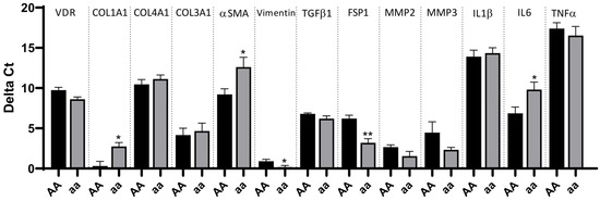 3.6. Fibroblasts Carrying the aa Genotype Expressed Lower Levels of Fibrotic Markers