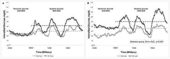 Early gestation, women with OB had a higher daytime mean glucose (91.0 vs. 84.8 mg/dL [95% CI for difference: 1.10, 10.53]) vs. NW and a correspondingly higher daytime glucose AUC (