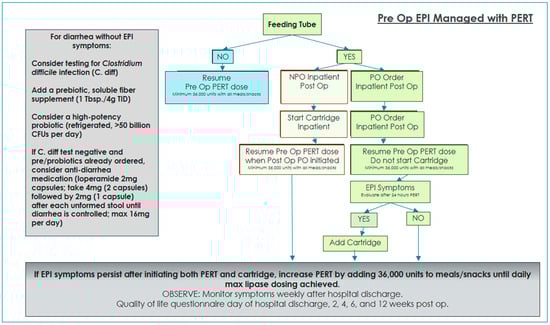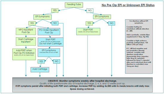 Two algorithms were developed and implemented in order to standardize EPI management and interventions with and without oral diet orders while on enteral feedings [3]. Enteral nutrition patients with oral diet orders were given PERT for 24 h and then re-evaluated for ongoing or resolved EPI symptoms. If symptoms persisted after 24 h of EPI management with oral PERT alone, immobilized lipase cartridges were added to provide EPI management for tube feeding.