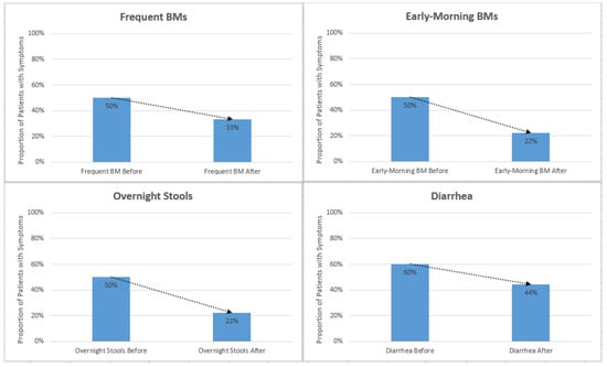 Reported instances of diarrhea, urgency, overnight stools, early-morning stools, frequent stools, and gurgling decreased after initiation of enzyme cartridges. Abbreviation: bowel movement (BM).