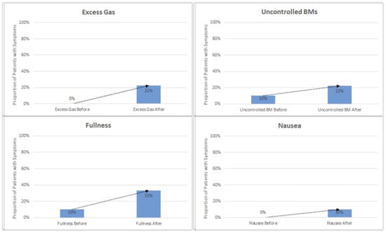 The results were analyzed based on symptom presence before and after surgery. Standard deviation and a t-test were used for statistical analysis. Reported instances of diarrhea, urgency, overnight stools, early morning stools, frequent stools, and gurgling decreased after initiation of enzyme cartridges (Figure 3 and Table 2).