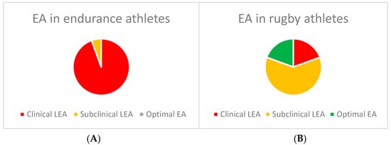 (A,B) representing the EA levels in endurance athletes (E) and in rugby players (R), respectively. In E athletes, no optimal EA was observed, while in R players, the majority were within the subclinical and optimal range.